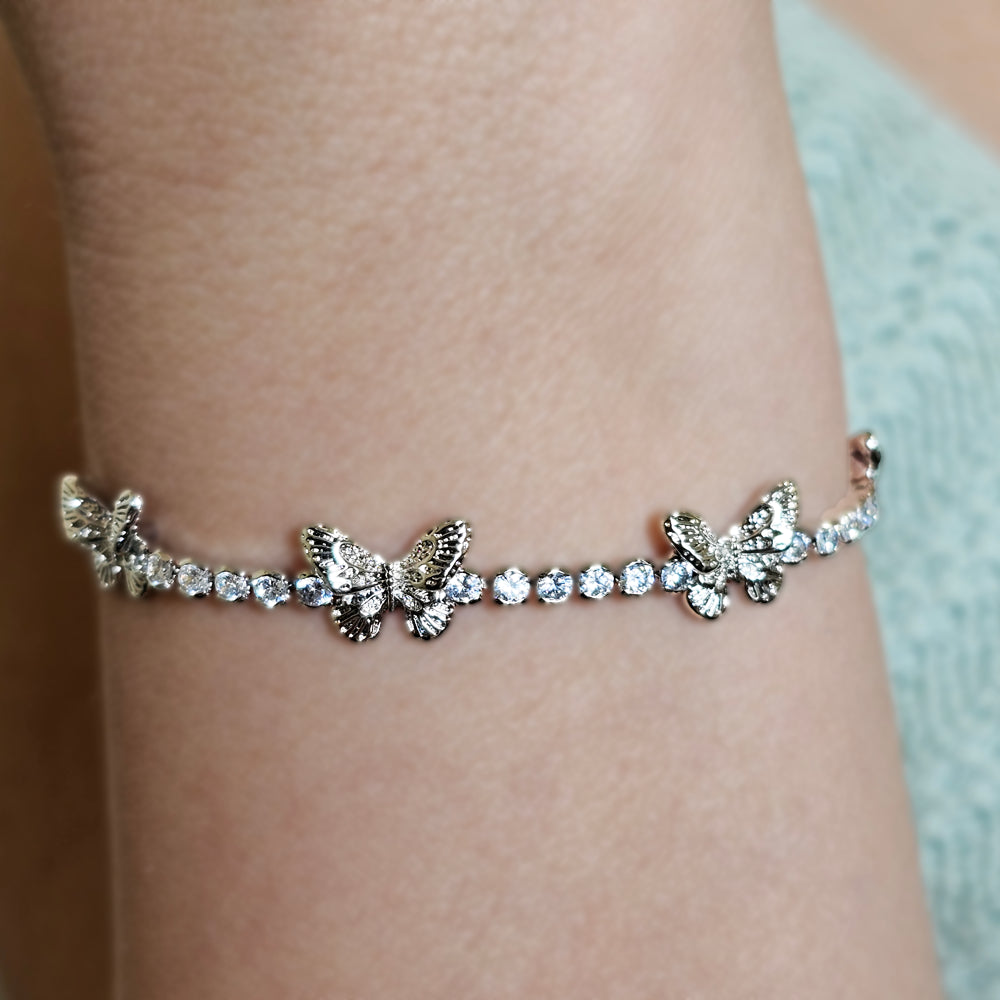 Pulsera bañada en oro con delicada cinta de circones y elegantes mariposas doradas. Un diseño brillante y femenino que refleja sofisticación y encanto en cada detalle.