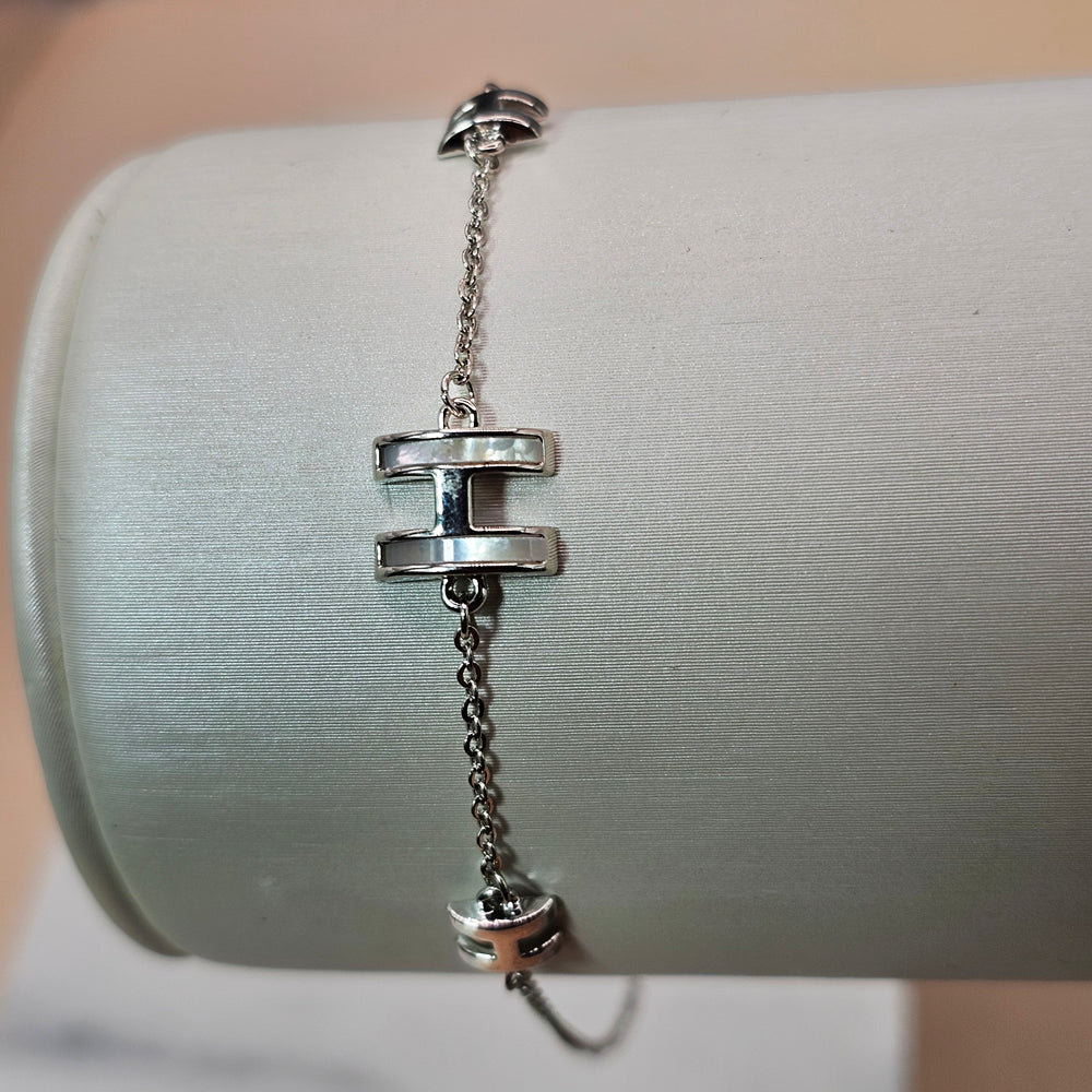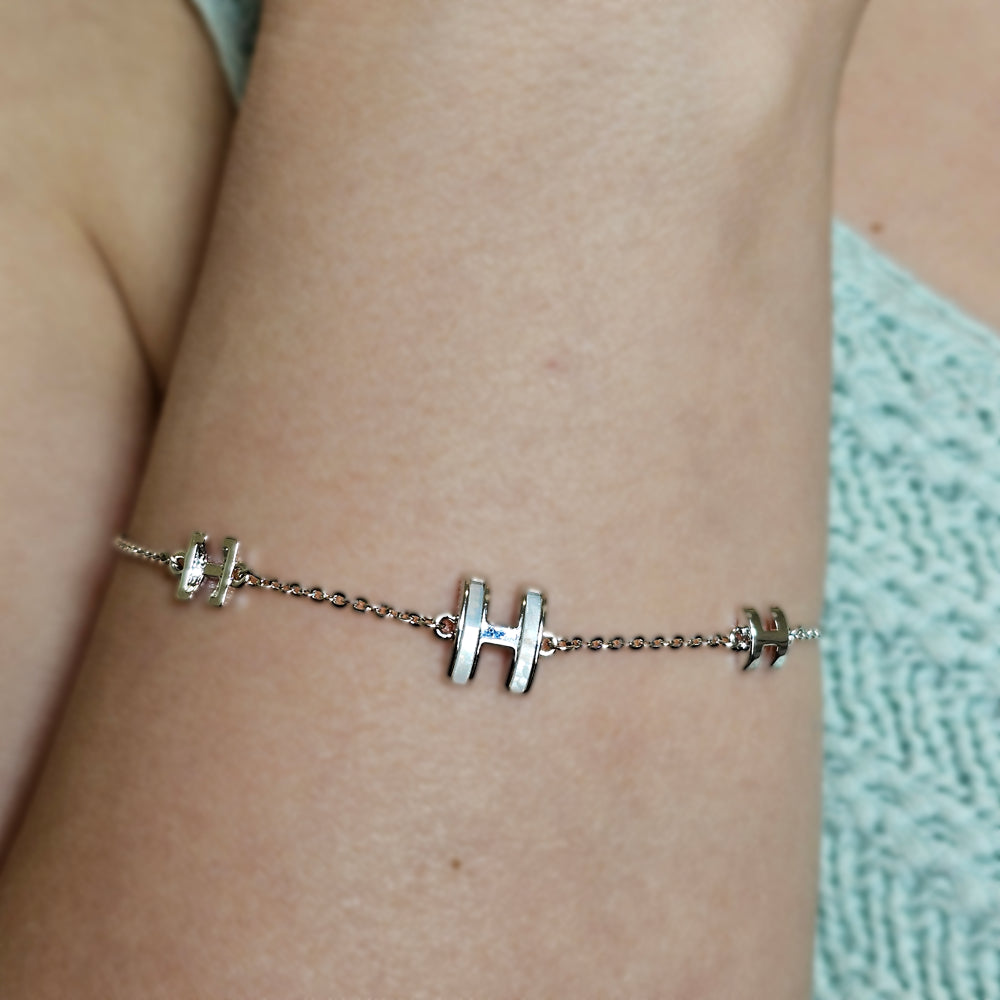 Pulsera bañada en Plata Rodinada con delicadas figuras en forma de “H”, símbolo de elegancia y estilo atemporal. Un diseño sofisticado que realza cualquier look con un toque moderno y refinado.