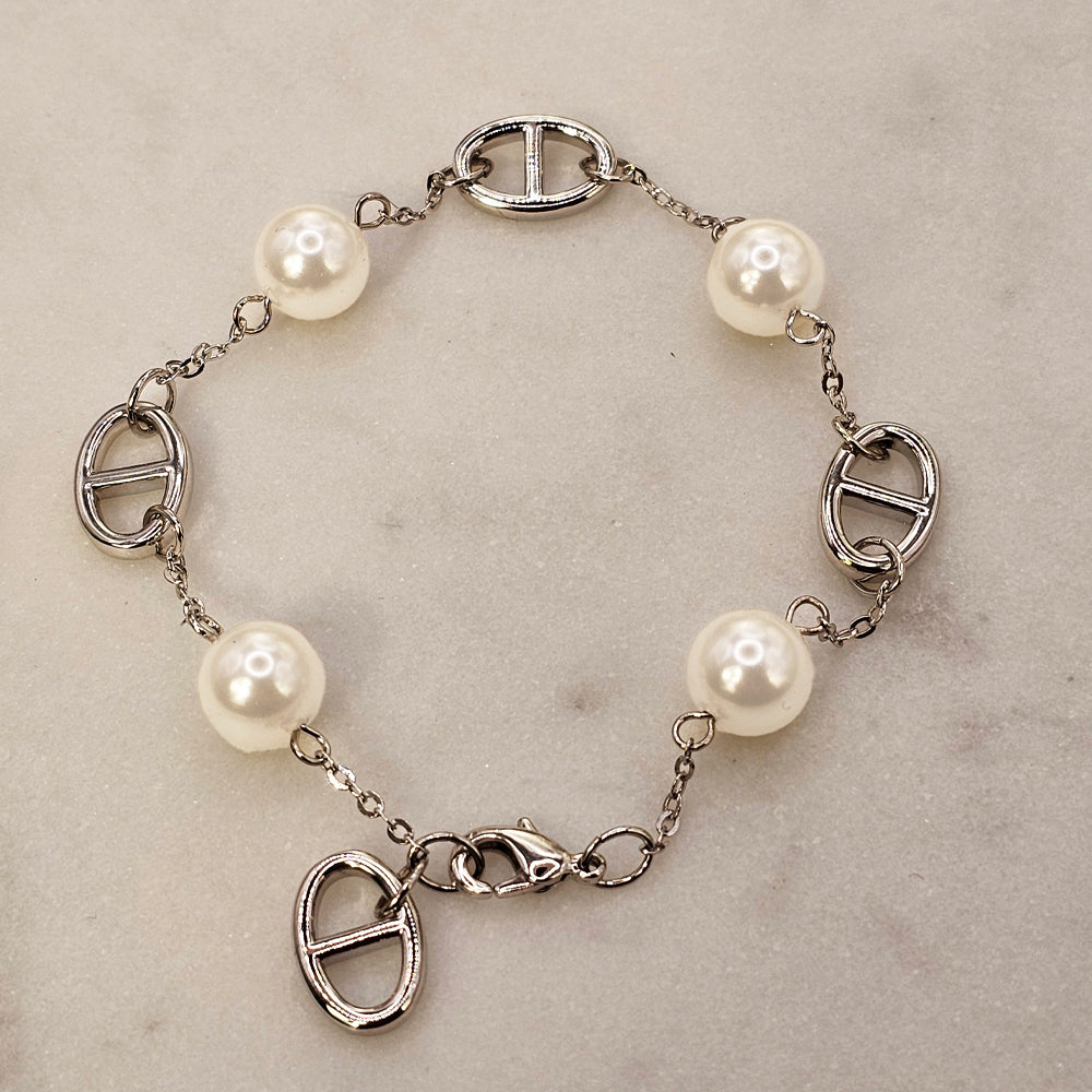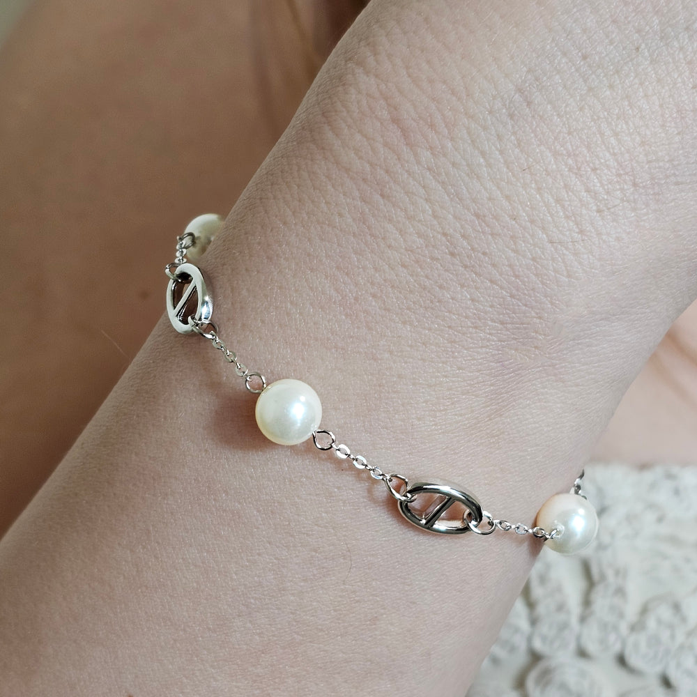 Pulsera bañada en plata rodinada, diseñada con delicados eslabones de ilusión que se entrelazan con el brillo sutil de finas perlas. Una pieza sofisticada y atemporal que combina la elegancia clásica con un toque moderno, perfecta para realzar cualquier estilo con distinción.
